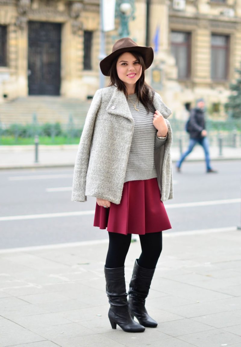 burgundyskirtgreycoatbrownhat