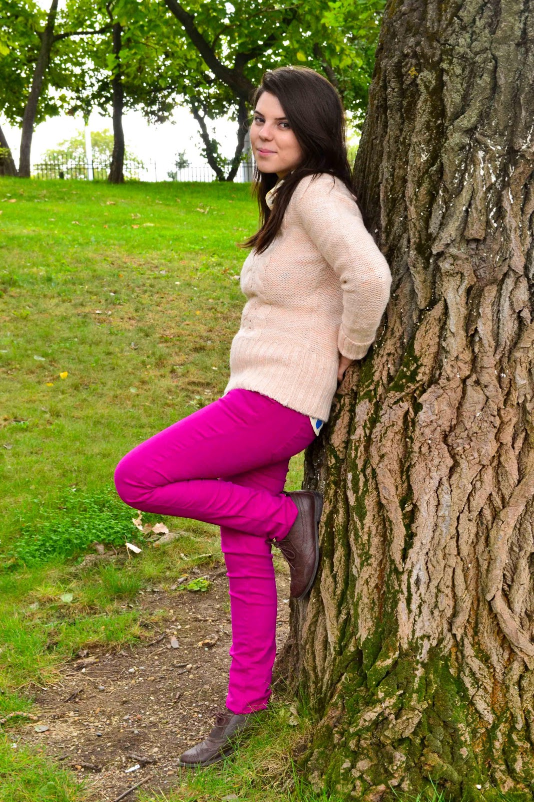 Grozava ideea de a pune acea camasa sub pulover! Culoarea pantalonilor e trasnet!:D