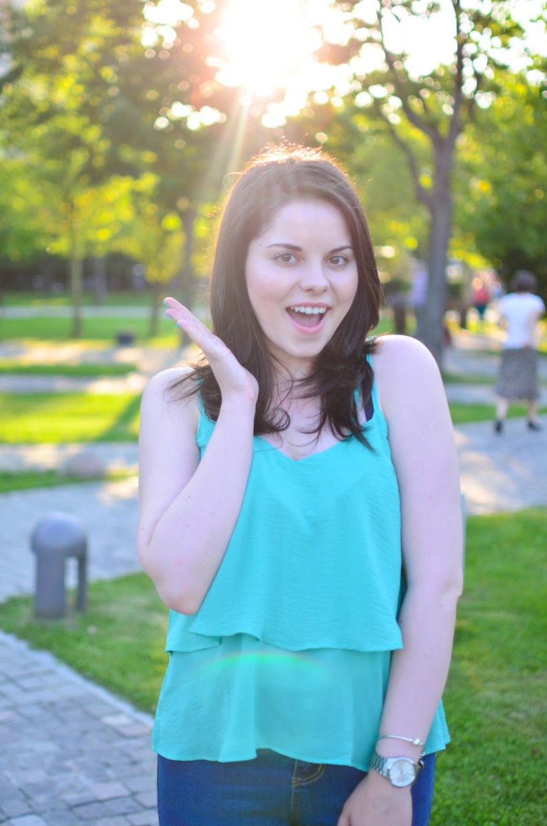 Revenind la postarea de azi: am ales o tinuta simpla, dar chic in care m-am simtit super bine. Vara ador culorile, insa unele nuante parca nu prea ajung sa le port pe cat de mult mi-as dori. Asa se intampla si cu verdele si de aceea am luat masuri si mi-am comandat un maiou si o geanta in aceasta nuanta.